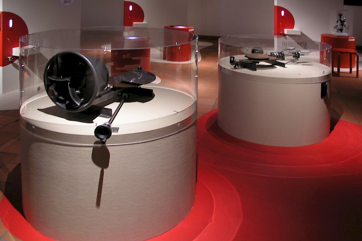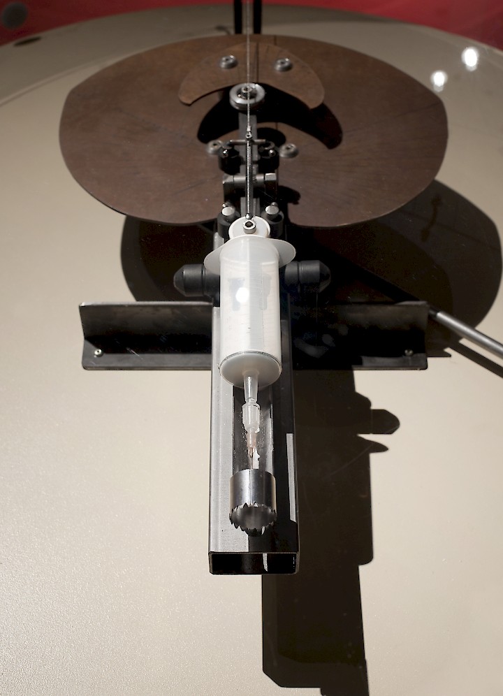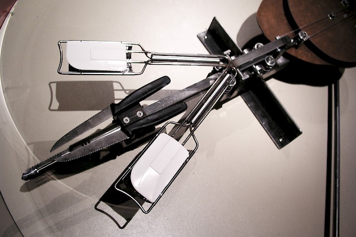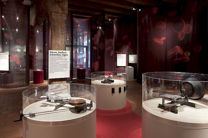 Durch Maschinen zum Kurbeln werden die Stech- und Beissmechanismen von Zecke, Mücke und Blutegel anhand von Alltagsgegenständen dargestellt. Ausstellungsgestaltung: Grönland Basel
