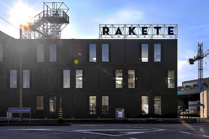 Beschriftung der Ateliercontainer «Rakete» Dreispitzareal Basel. Gestaltung: Hauser, Schwarz Basel