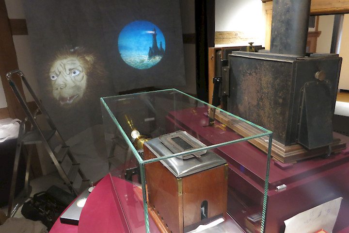 Mechanik zu zwei Laternamgicas, Bewegung der Lichtbilder, Löwenaugen, Ruderboot Bespiele von weiteren bewegten Lichtbildern, Mandala, Vogelflug Museum MUKS, Riehen Raum "STAUNEN" Szenographie: Emyl, Basel