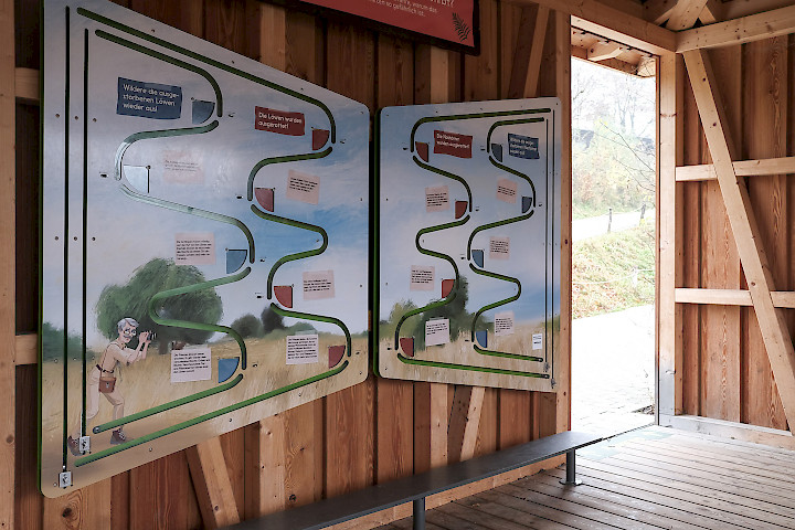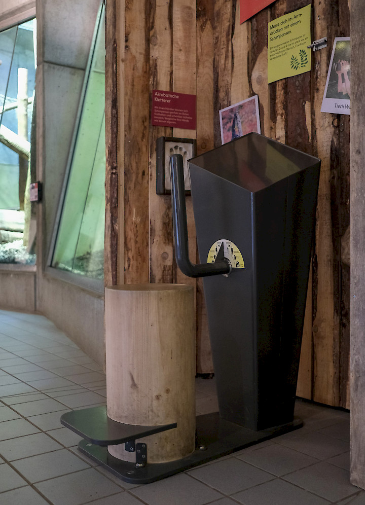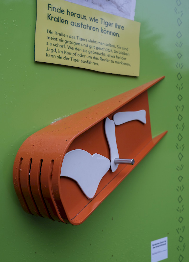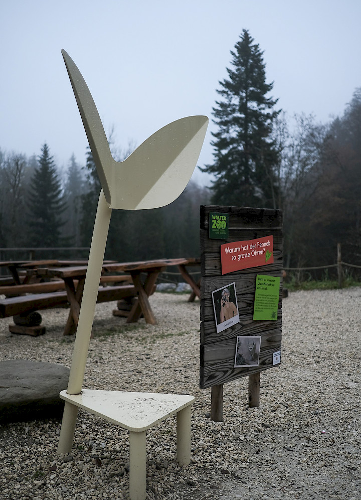 Überdimensioniertes Ohr vom Fenek Armdrücken mit dem Schimpansen Funktion der Tigerkralle Kugelbahn bei Löwenanlage Gestaltung: Studio das, Johannes Stieger, St. Gallen